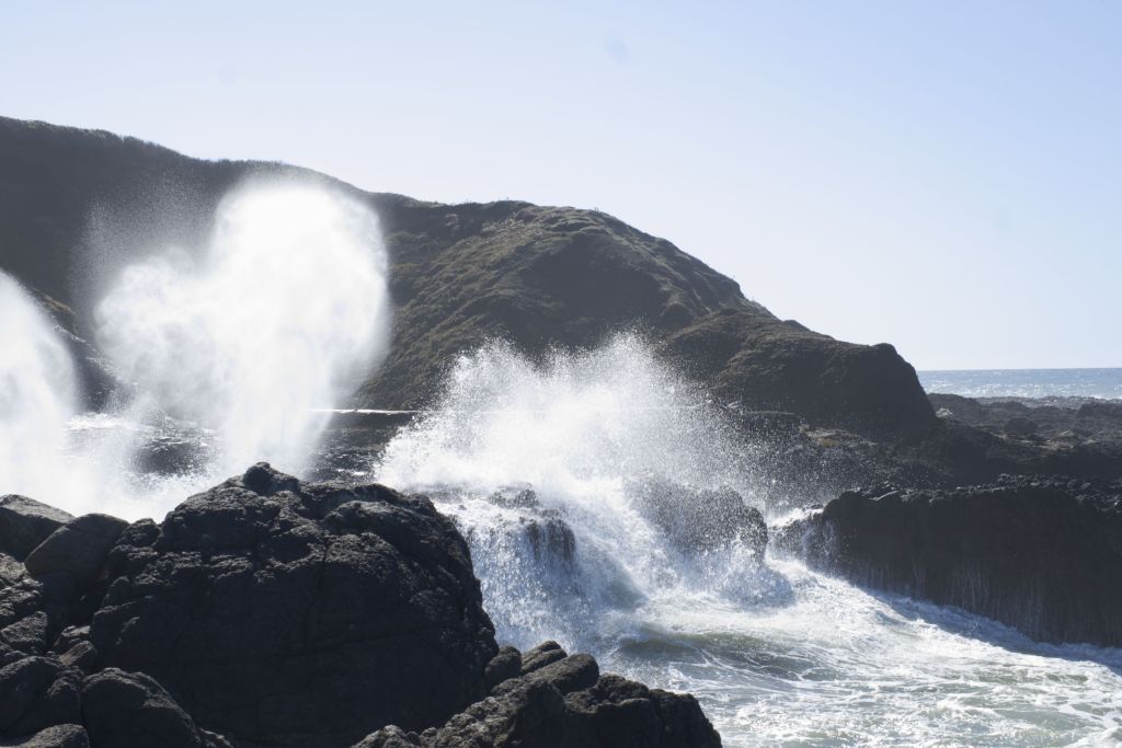 What was supposed to rekindle my interest after this backfired. I took a trip with my parents to the central Oregon Coast with the expectation of getting good splash pictures. I did, but it’s unfortunately a mind-numbing experience sifting through the resultant shots with burst fire (even at what’s considered a slow rate). I did get a couple interesting ones, but these are out of a few thousand: One has a spouting horn and a neighboring open splash going simultaneously, and the other hides a rainbow where I didn’t expect to find one. If I’m not mistaken, both of these are taken not far from Thor’s Well.