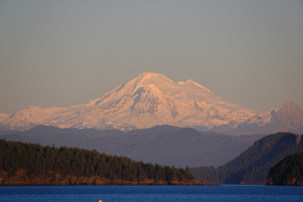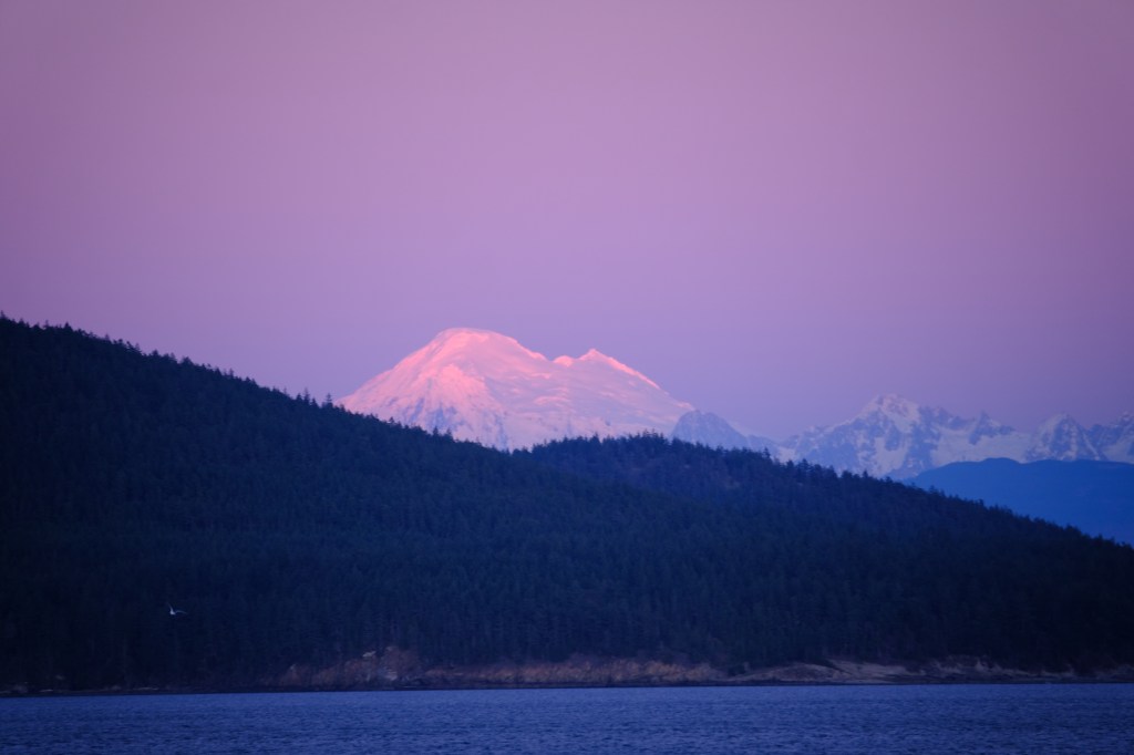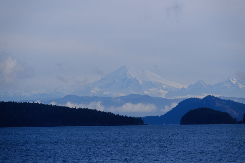 Mount Baker (at least I believe it’s Mount Baker, another tourist kept insisting it was Whistler) made itself a prominent star. This was on the outbound sailing…